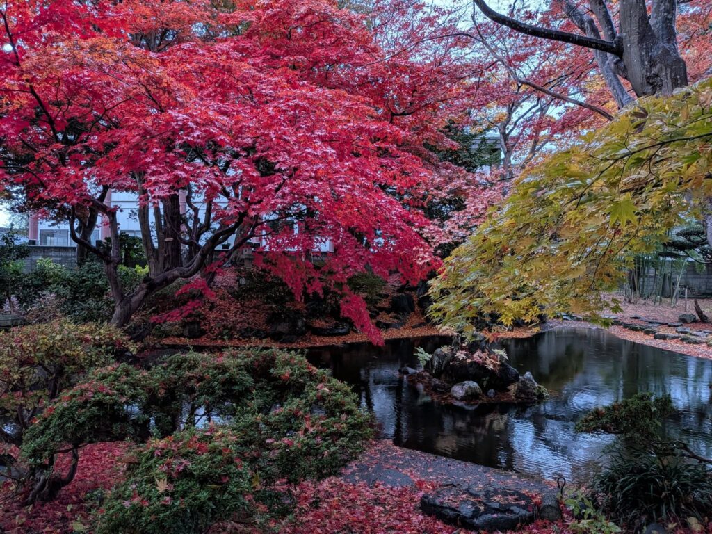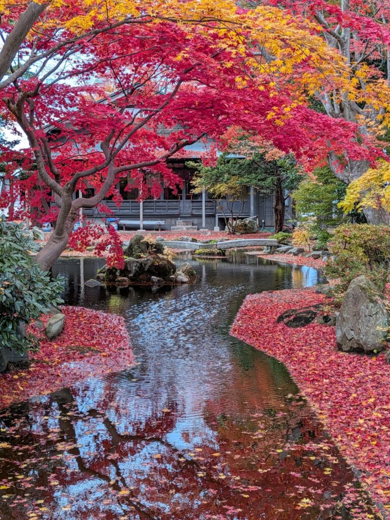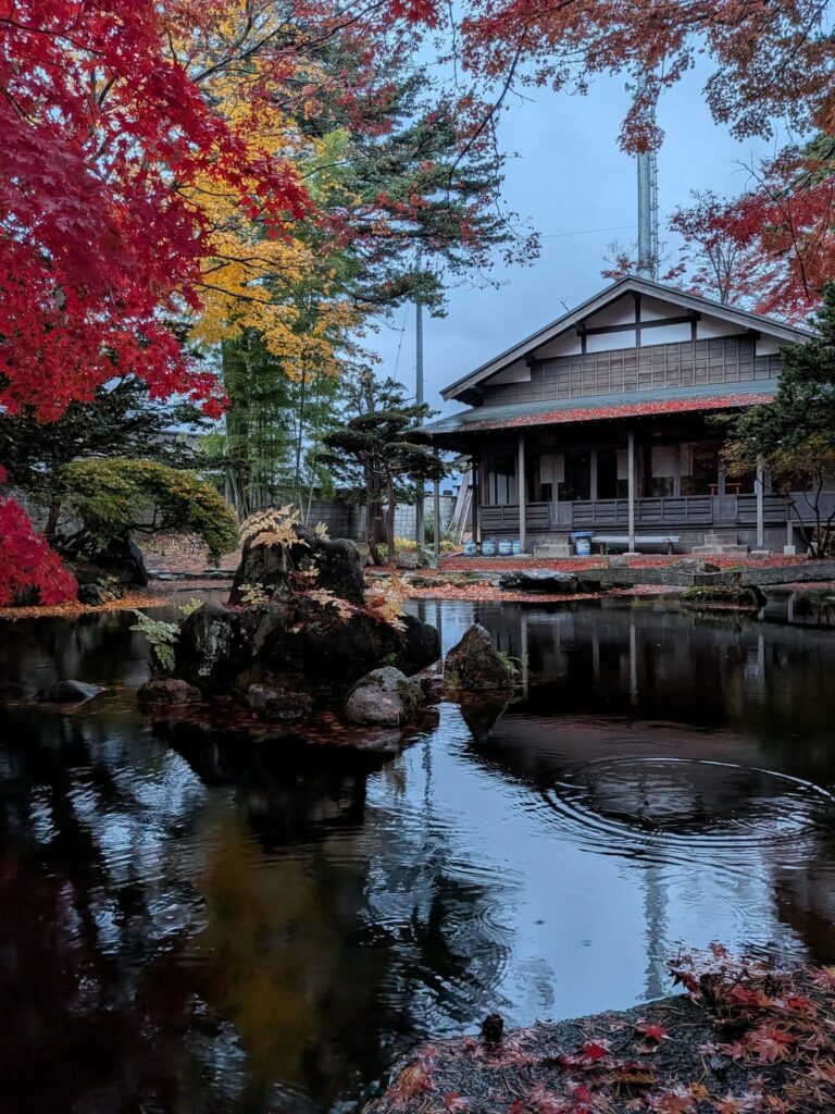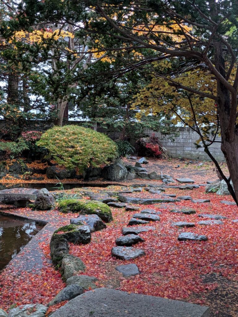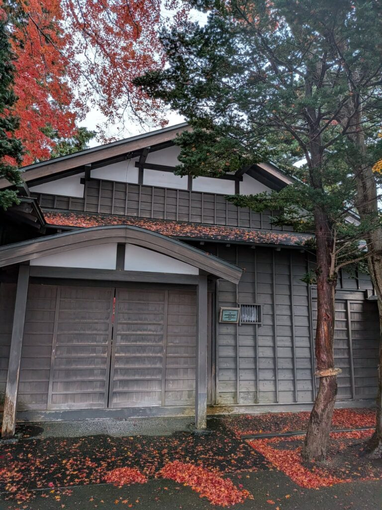 野辺地町役場の隣にある「行在所(あんざいしよ)」の庭はいま紅葉の見頃です。この場所は、明治のはじめに天皇が行幸した折、野辺地にも訪れ宿泊した野村家の別荘です。野村治三郎氏は北前船船主で豪商と言われていました。
