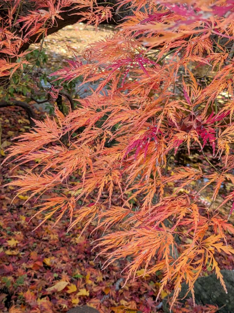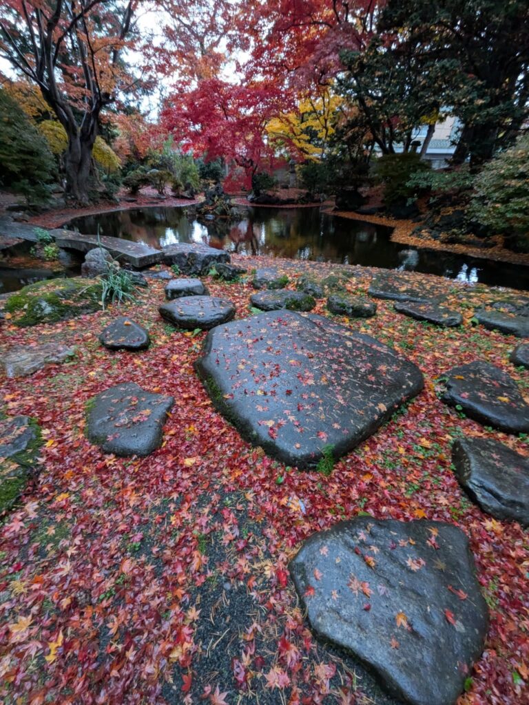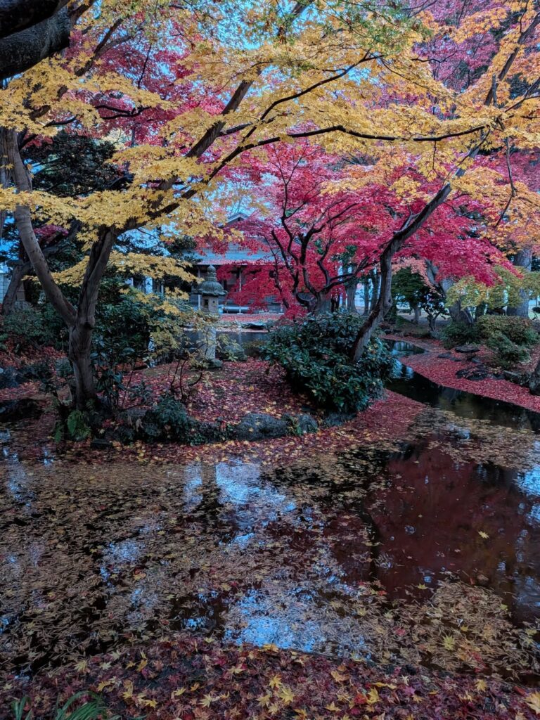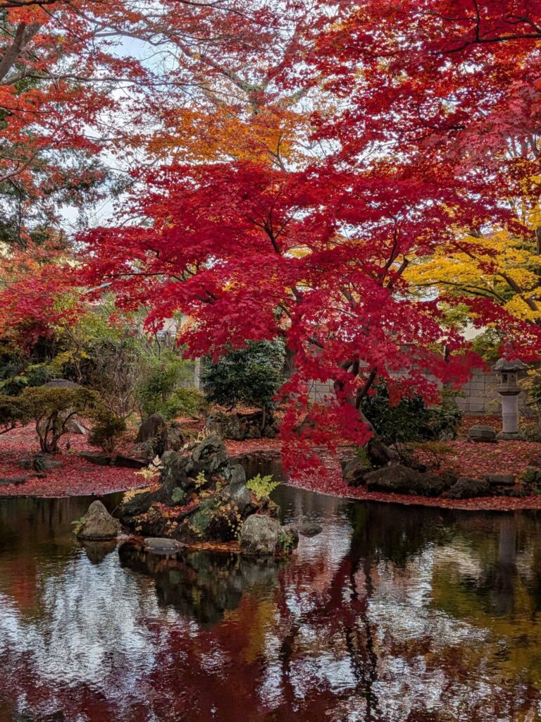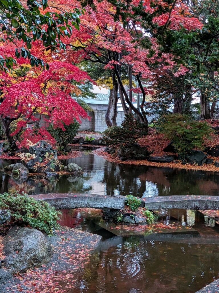 野辺地町役場の隣にある「行在所(あんざいしよ)」の庭はいま紅葉の見頃です。この場所は、明治のはじめに天皇が行幸した折、野辺地にも訪れ宿泊した野村家の別荘です。野村治三郎氏は北前船船主で豪商と言われていました。