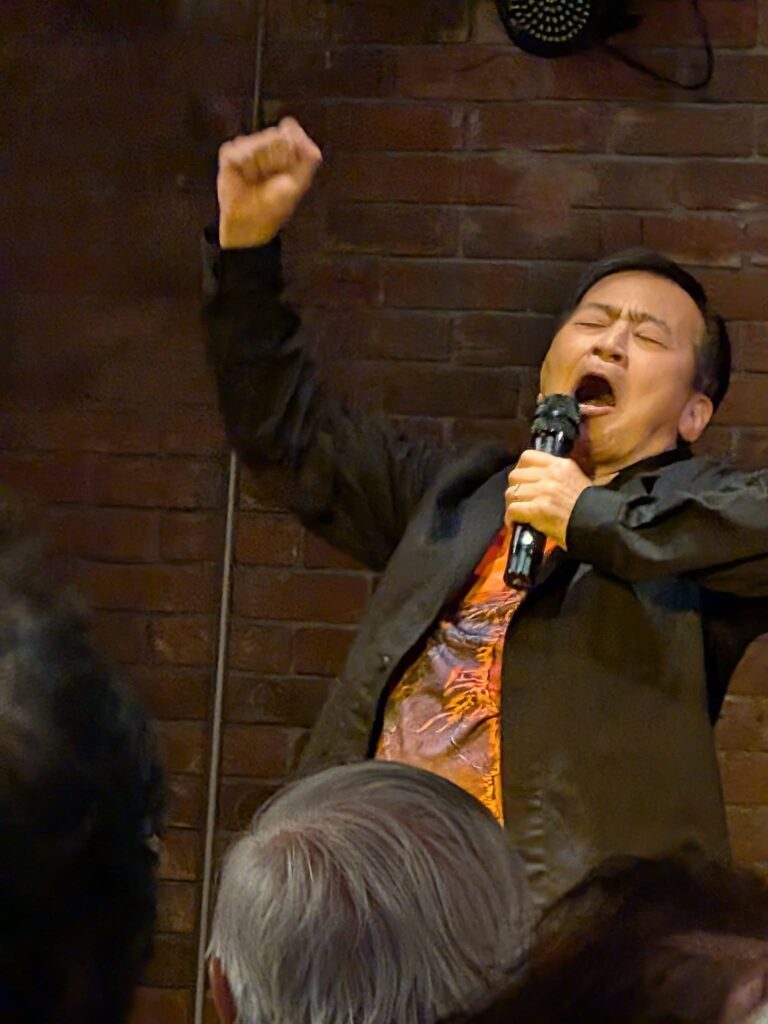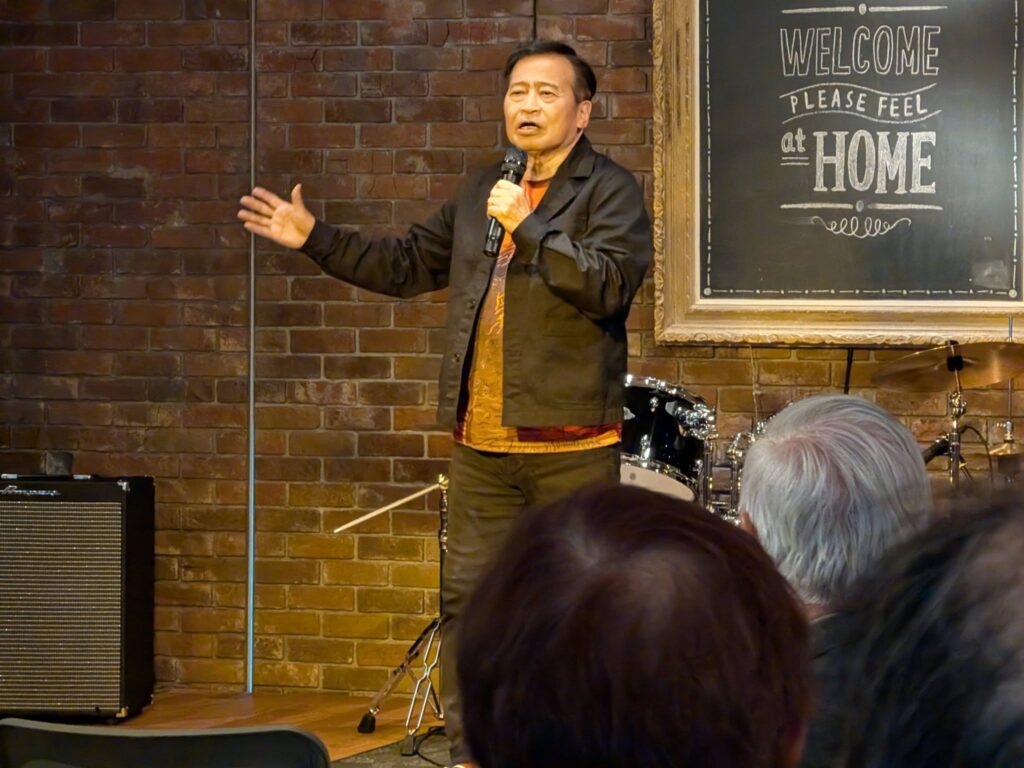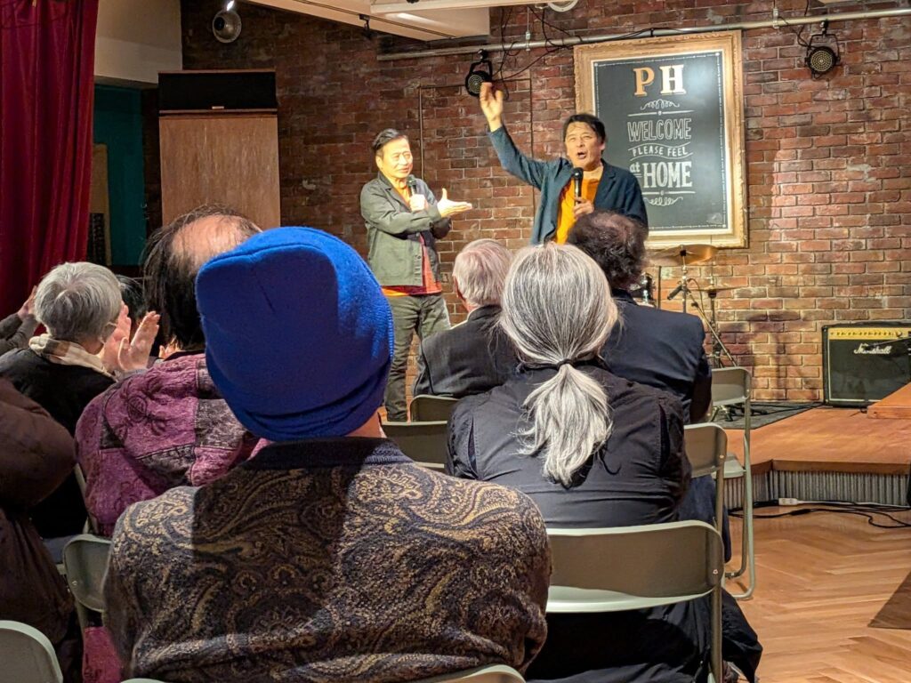 共演したコメデイアン清水宏さんは、会場の隅っこまで響き渡る声で、汗だくになり聴衆を自分に向けるコツを披露、話に引き込まれ大笑い