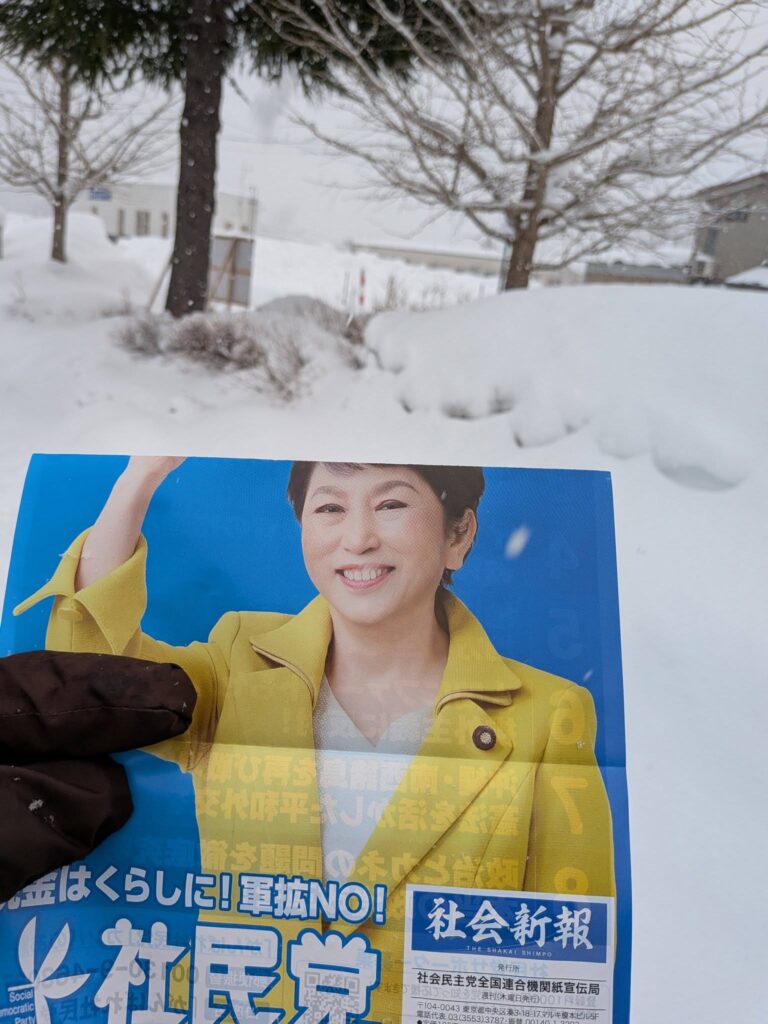 今日もしんしんと雪降り。休んで入られないので、町内と駅前方面に社会新報号外をポスティングしています。