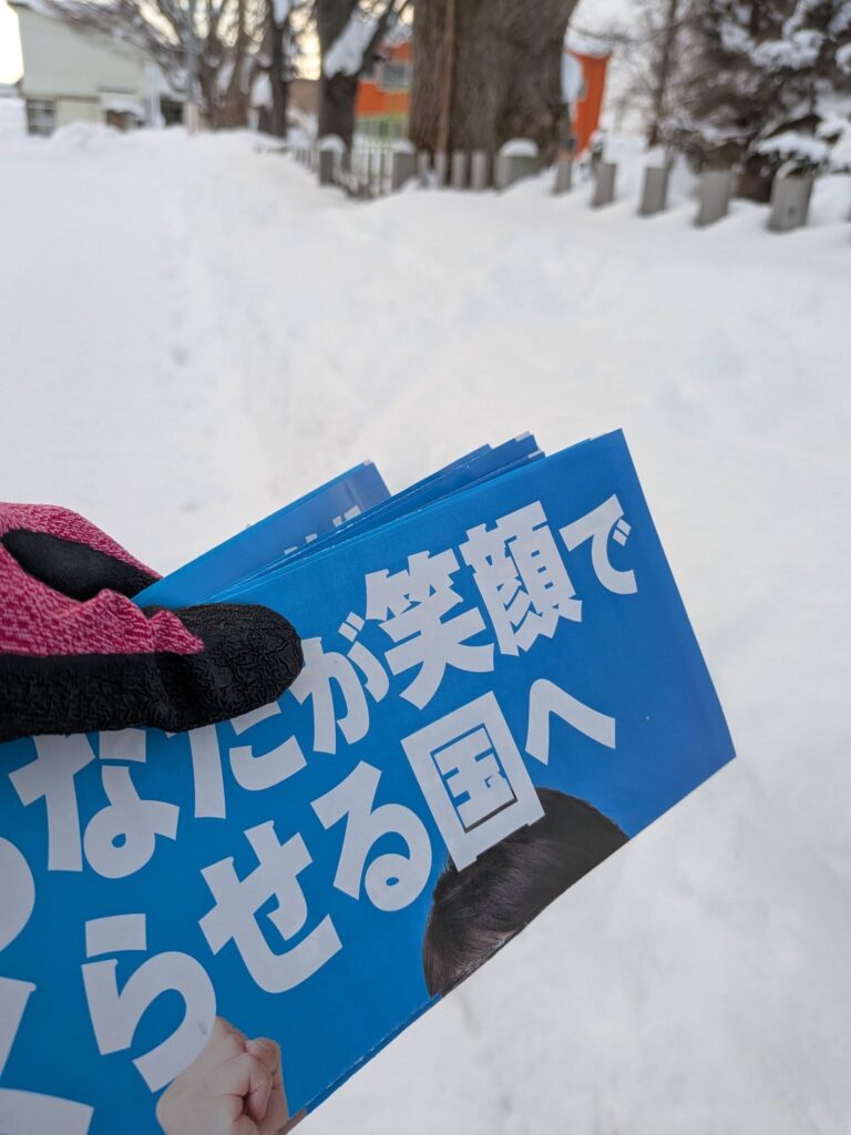再び雪の中だけど、1枚でも多くチラシを届けようと歩き始めました。